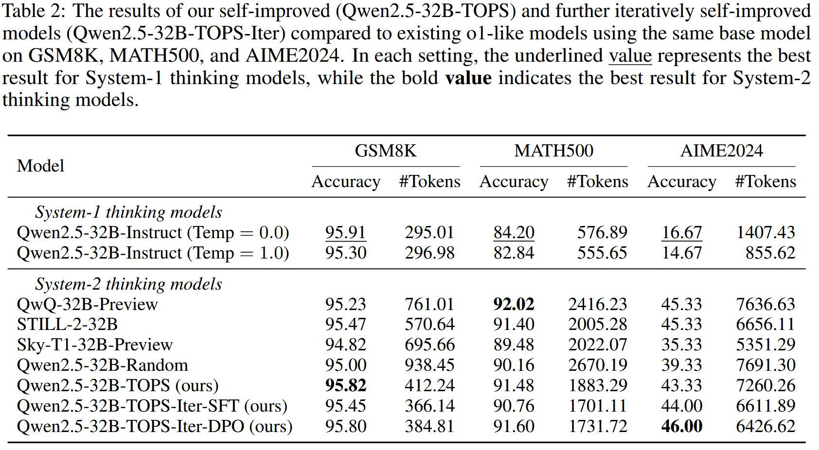 为了进一步提升模型在具有挑战性问题上的推理性能,我们在 Qwen2.5-32B-TOPS 上进行迭代自改进。具体而言,我们选择了额外的 4500 个 MATH 问题[13](这些问题是之前使用的问题中未出现过的)以及 AIME1983-2023 的问题。对于每个问题,我们从 Qwen2.5-32B-TOPS 采样 8 个响应。然后,在这 8 个响应中选择最短的正确响应作为选定响应。一种迭代自改进的方法是对由所有选定响应(最短正确响应)组成的数据集进一步监督微调 Qwen2.5-32B-TOPS,从而得到 Qwen2.5-32B-TOPSIter-SFT。此外,我们还可以执行偏好优化。具体来说,如果有最终答案错误的响应,我们选择最长的错误响应作为拒绝响应以提高推理能力。另外,如果存在比最短正确响应更短的错误响应,我们将这些错误响应中最短的一个作为拒绝响应,并包含这些偏好对,以避免模型思考不足。在获得偏好数据集后,我们在 Qwen2.5-32B-TOPS 上进行直接偏好优化(DPO)[28],得到 Qwen2.5-32BTOPS-Iter-DPO。