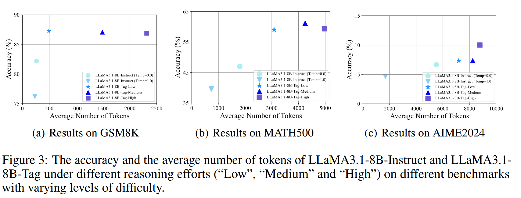 - 存在一个最佳的推理努力程度,它因任务难度的不同而有所差异。正如我们所见,在 GSM8K 上低推理努力始终表现最佳,而在较难的问题上,中等和高推理努力则更为有益。