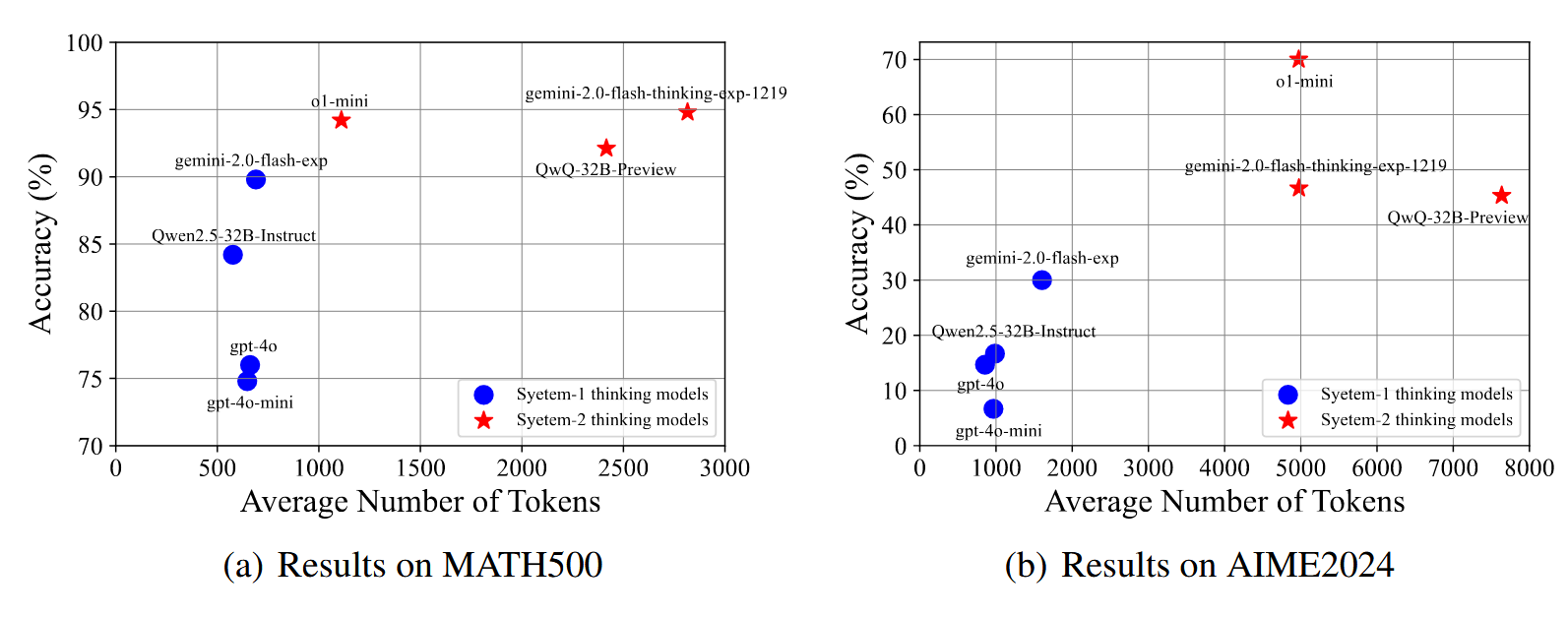 后续的 o1-like 模型(QwQ32B-Preview 和 Gemini2.0-Flash-Thinking)相比于 o1-mini 显示出较少的有效扩展效果,因为它们生成了更多的 token,但在从其对应的 System-1 思维模型扩展时获得的改进却更少。QwQ-32B-Preview 在这方面存在最严重的问题。这一初步分析在一定程度上表明,过度扩展到更长的 CoT 并不能最大化测试时间的扩展效果。