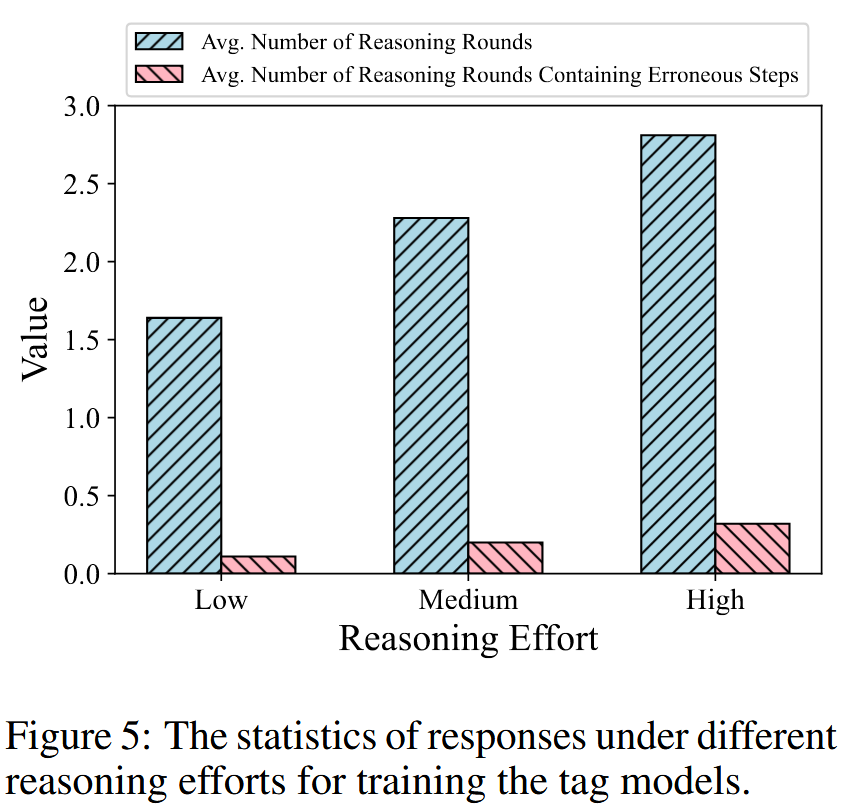 我们观察到当推理努力增加时,错误推理轮次的数量也增加。在更多错误步骤上训练模型会对模型的推理能力带来负面影响,这可以解释为什么高推理努力的扩展会导致更差的结果。因此,我们可以得出结论,虽然包含某些错误且具有反思性的步骤可以帮助模型在推理过程中学习纠正错误,但过多的错误步骤可能会对模型的学习产生有害影响。