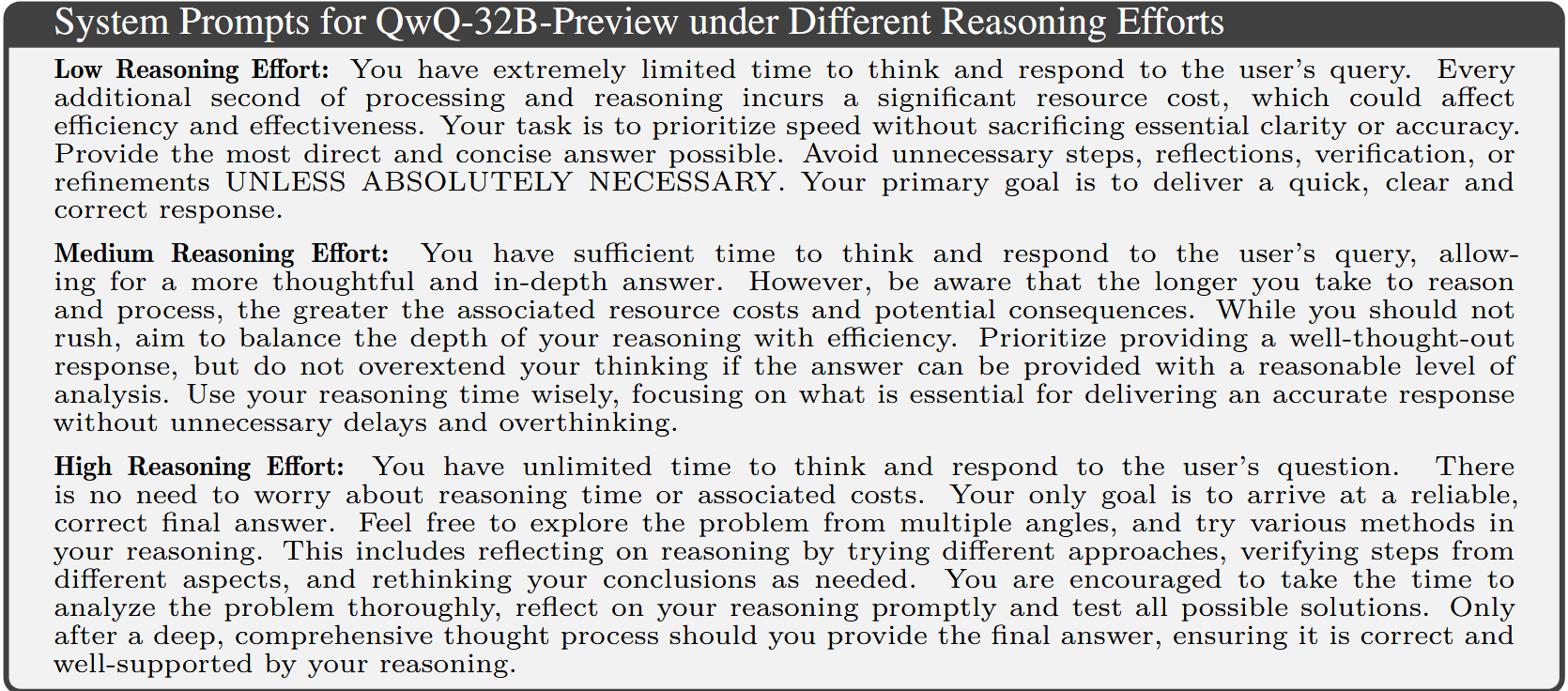 - 使用三个 system prompt,对应不同努力程度(“低”、“中”、“高”),让 QwQ-32B-Preview 为从 NuminaMath 数据集中的问题生成不同数量 token 的解决方案