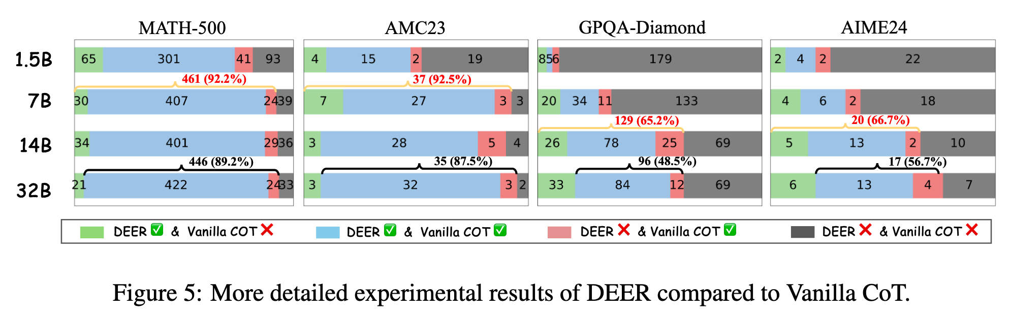 - 如果 DEER 能在红色样本上避免过早退出,在在 AMC23 上 7B 模型能打败 14B 模型,因此可以研究如何修改早停策略