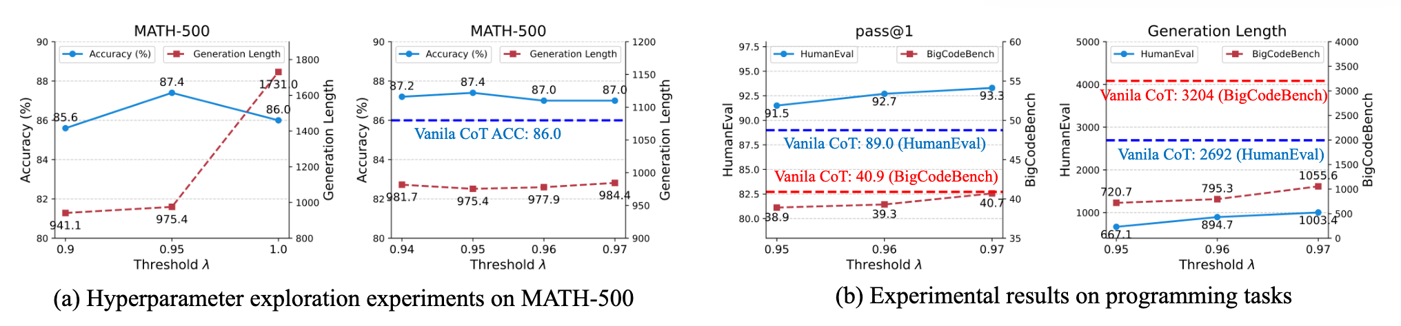 此外,还验证了一下原始推理是正确/错误的但是使用早停机制后正确的数量(Threshold 为 1.0 代表原始推理)