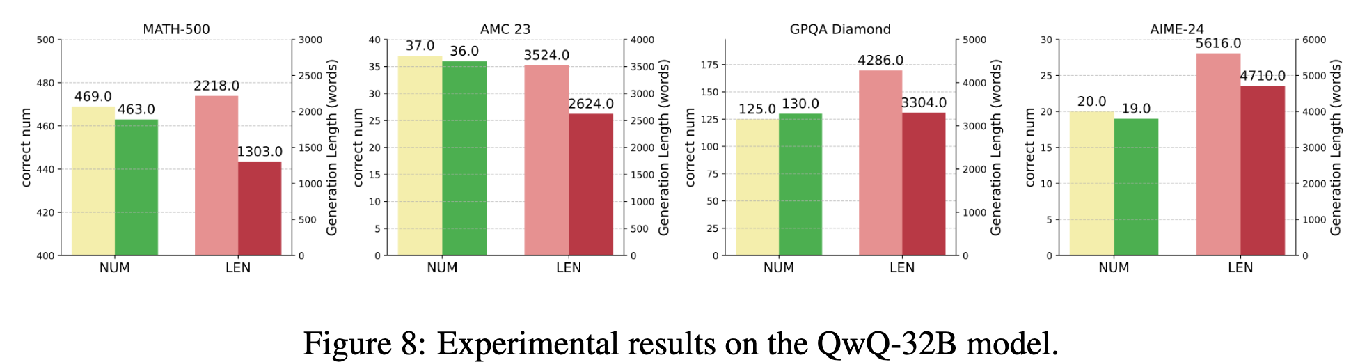 选择 AIME2024 数据集,让 DeepSeek-R1-Distill-Qwen-14B 进行完整推理和解答,然后从 think 过程中找出“Wait”这个 token,基于这个 token 将完整的推理划分为思考片段,然后仅保留 len(思考片段) > 5 的样本。对于这些样本保留了其不同比例(20%-90%)的思考片段,并在每个截断的推理序列末尾添加了一个结束思考的 token 分隔符,以强制终止慢思考过程。结果如下图