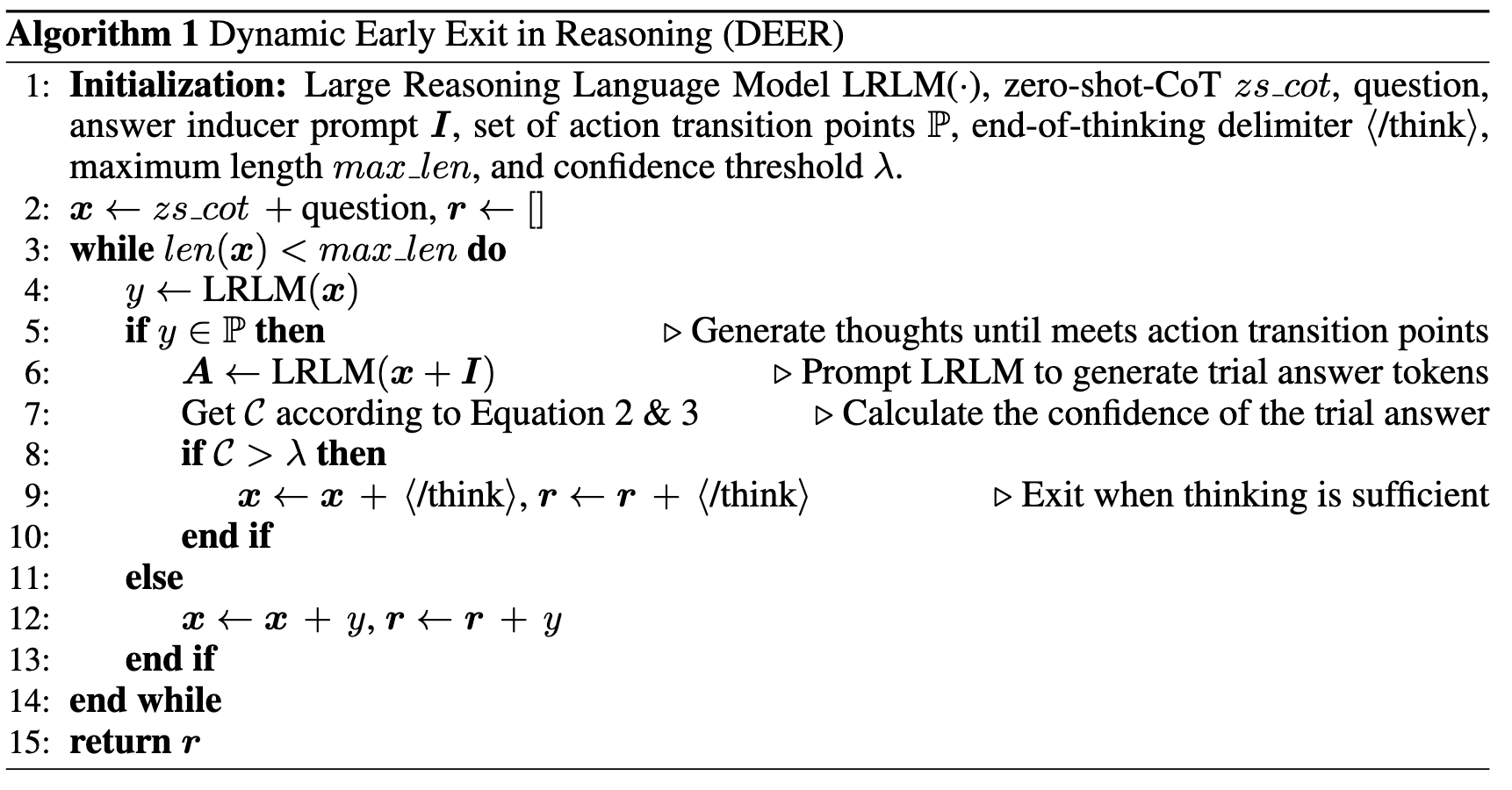 近期大型推理语言模型(LRLMs)的进展依赖于测试时扩展,这将长链条思维(CoT)生成延伸以解决复杂任务。然而,过长的 CoT 不仅会降低问题解决的效率,还可能因过于详细或冗余的推理步骤而导致准确性损失。我们提出了一种简单而有效的方法,允许大型语言模型(LLMs)在生成过程中通过早期退出机制自我截断 CoT 序列。与依赖固定启发式规则不同,所提出的方法在潜在的推理转换点(例如,“Wait” tokens)监测模型行为,并在模型对试探性答案表现出高置信度时动态终止下一推理链的生成。我们的方法无需额外训练,可无缝集成到现有的类似 o1 推理 LLMs 中。在多个推理基准测试 MATH-500、AMC 2023、GPQA Diamond 和 AIME 2024 上的实验表明,所提出的方法在 deepseek 系列推理 LLMs 上始终有效,平均将 CoT 序列长度减少 31% 至 43%,同时将准确性提高 1.7% 至 5.7%。