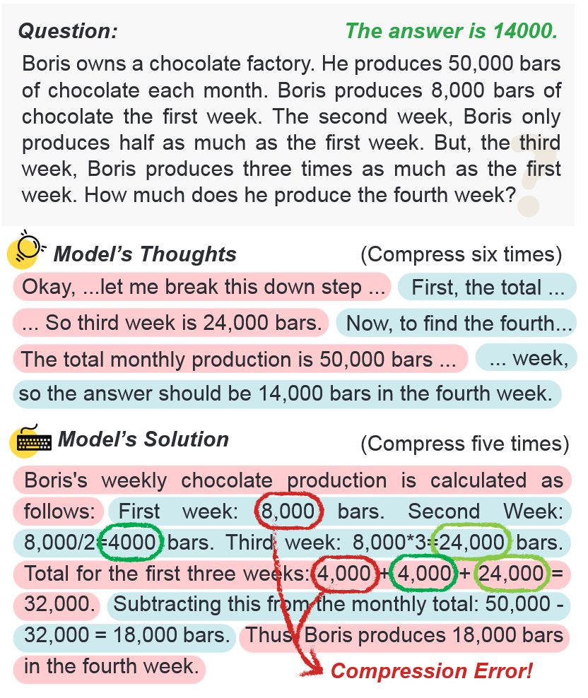 - thought 水平:每个段落压缩一次(以\n\n 分割)。对于 Qwen,压缩成 9 个 token;对于 LLama,压缩成 7 个(能不能考虑考虑压缩成动态个 token)。decoder 使用最大 output 为 10k 个 token 的贪婪 decode