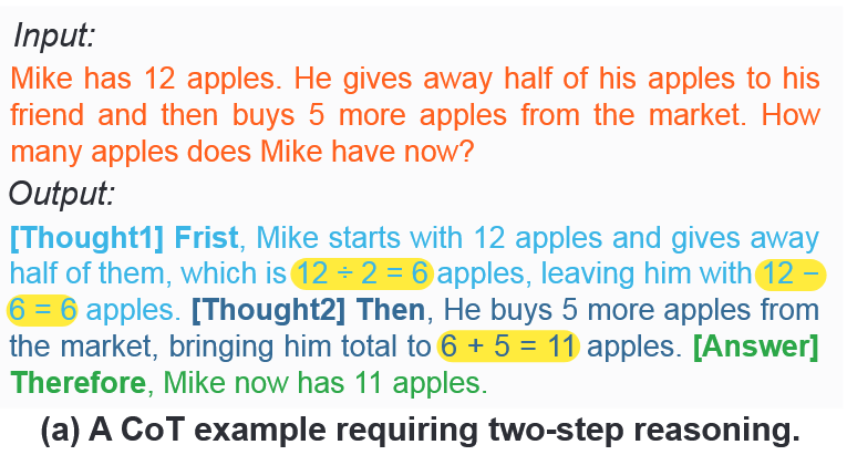 - 人类思考时往往只写下关键步骤(下图黄色部分),但是其他思考过程放在脑子里面(相当于脑内推理,推理到一个关键节点是压缩成一个关键步骤,并写下)