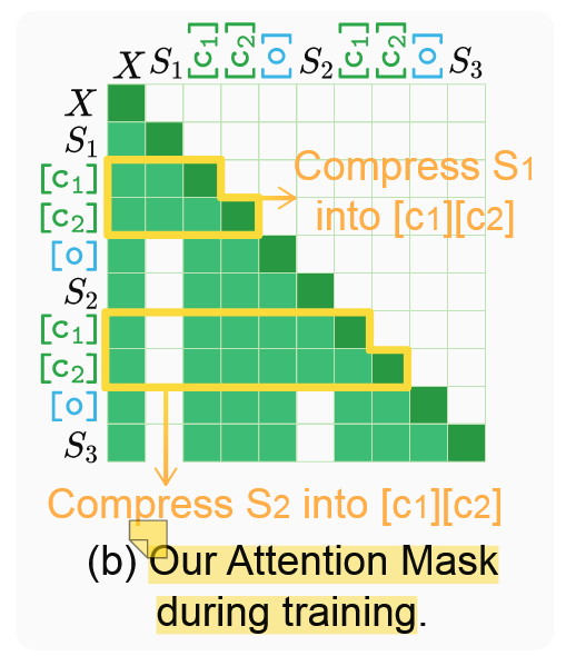 在训练过程中,LLM 不允许预测输入 X 以及特殊标记 C 和[o]。训练样本来自 D_h,我们使用注意力掩码来鼓励 LLM 学习压缩和解析压缩内容。整个训练过程仍然基于下一个标记的预测。