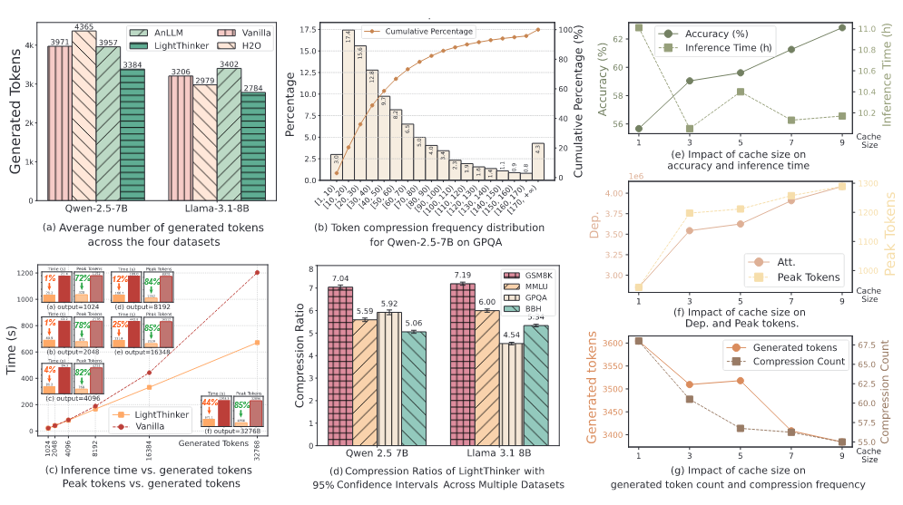 大型语言模型(LLMs)在复杂推理任务中表现出色,但它们的效率受到与生成长序列相关的大量内存和计算成本的阻碍。在本文中,我们提出了一种名为 LightThinker 的新方法,该方法使 LLMs 能够在推理过程中动态压缩中间思维。受到人类认知过程的启发,LightThinker 将冗长的思维步骤压缩为紧凑的表示形式,并丢弃原始推理链,从而显著减少存储在上下文窗口中的令牌数量。这是通过在数据构建时训练模型何时以及如何进行压缩,将隐藏状态映射到浓缩的主旨令牌,并创建专门的注意力掩码来实现的。此外,我们引入了依赖性(Dep)指标来量化压缩程度,通过测量生成过程中对历史令牌的依赖来衡量。在四个数据集和两种模型上的大量实验表明,LightThinker 减少了峰值内存使用量和推理时间,同时保持了有竞争力的准确性。我们的工作为在保持性能的前提下,提高 LLMs 在复杂推理任务中的效率提供了新的方向。