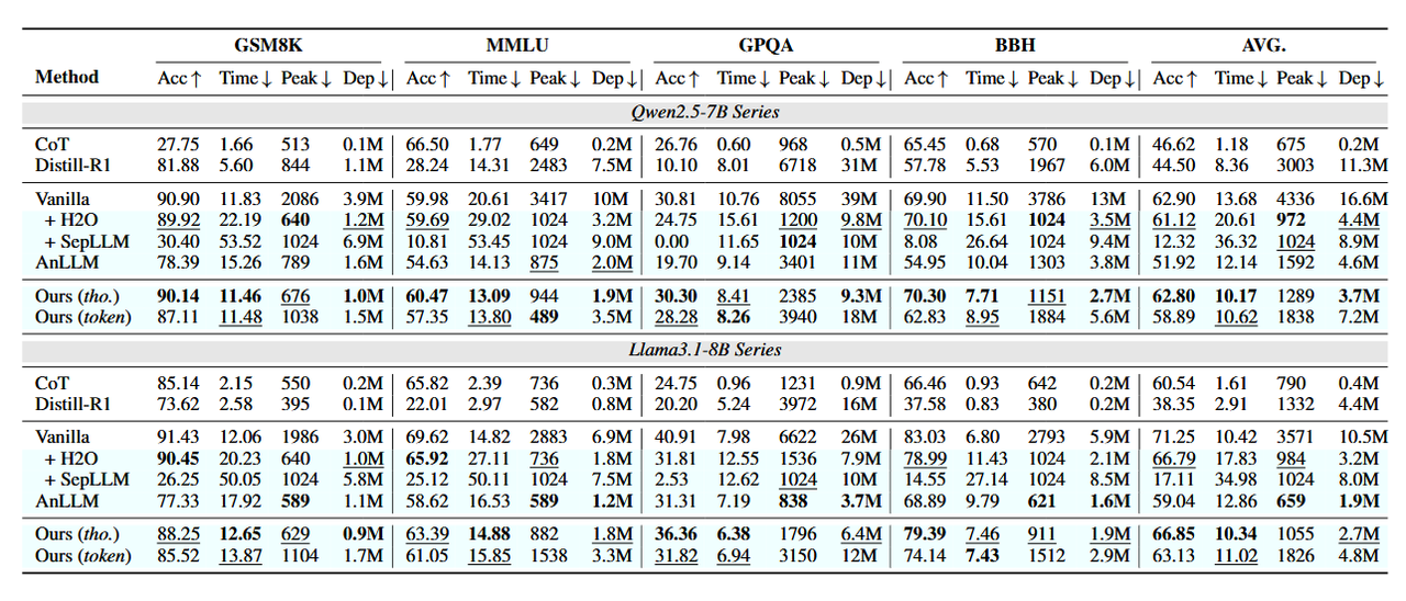 5 个 baseline:在 Bespoke-Stratos-17k 数据集上全量微调过的 Qwen2.5-7B 和 Llama3.1-8B(Vanilla);使用 H2O(training-free 方法)加速 Vanilla;基于特定策略保留重要 KV-Cache 的 SepLLM 加速 Vanilla;AnLLM;CoT+instruction Model;CoT+R1-Distill。