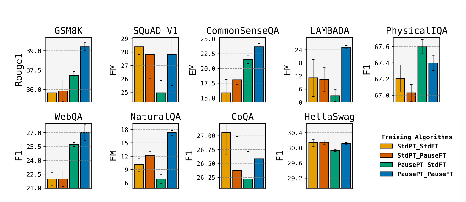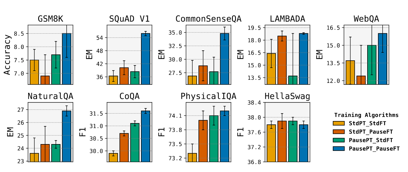 1B 模型除了 HellaSwag 数据集上,Pause 预训练-PauseFT 的组合(蓝色)均优于标准预训练-标注 FT(黄色)的组合