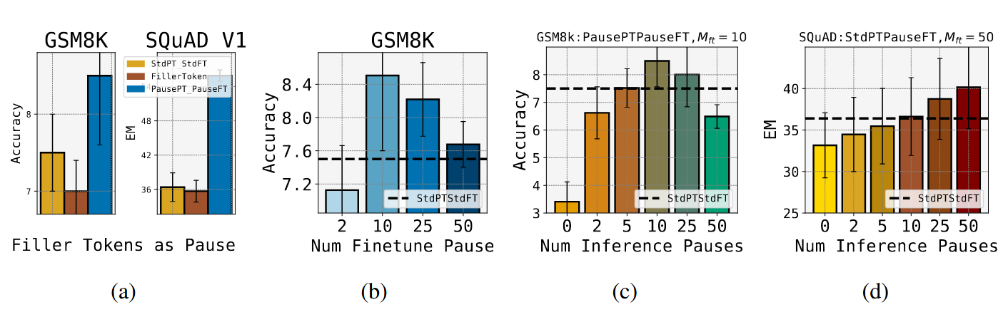 在推理时,在 prefix 后添加 M_inf(实验中与 M_ft 一致)个 pause token,并忽略模型输出直到计算到最后一个 pause token 才开始输出。
