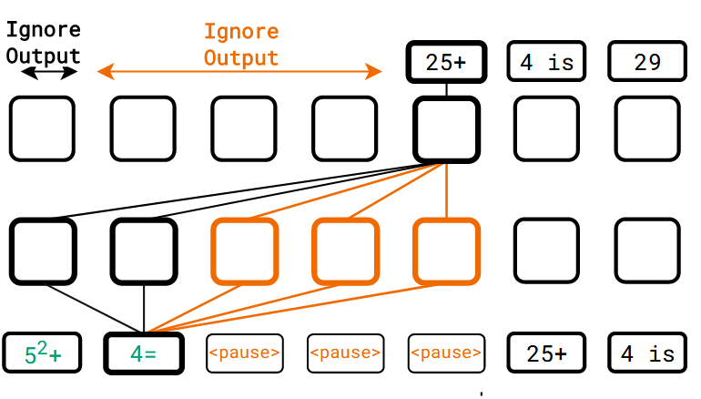 引入 <pause> token(模型可学习的 token),将其插入输入序列中,延迟模型的输出,从而让模型在每层中额外计算更多 hidden states 用于生成下一个 token。