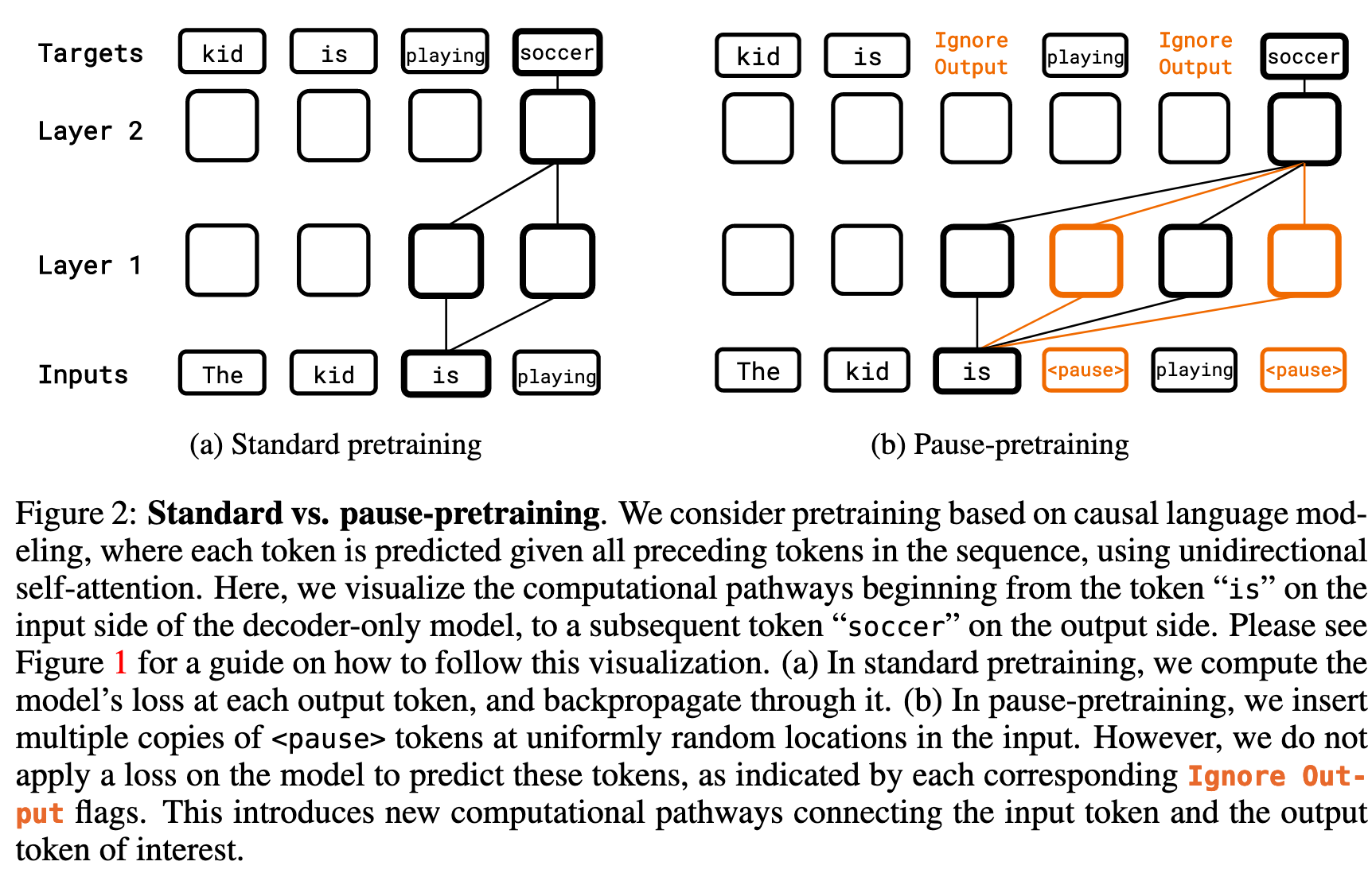 因此作者的做法是对于给定的预训练序列 p 在均匀随机的位置插入 M_pt 个 pause token(如下图 b)。然后,在加入了 pause 的 token 序列上使用标准的 next token prediction loss 来训练模型,同时在计算损失时跳过 pause token。最后,更新模型及其所有 token(包括