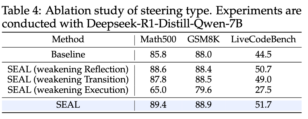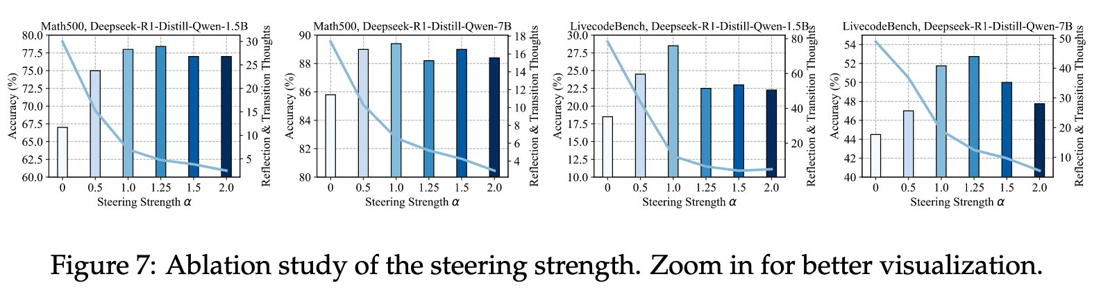Logit Penalty(即 token 空间调整)方法的一个局限性在于,它通常针对单个 token 进行操作,例如 alternatively 或 wait,而不是在概念层面进行调整。然而,反思和过渡性思考通常通过短语或更长的句子表达,例如 let me double-check 或 another approach is。这种情况仅通过 Logit Penalty 难以完全抑制。此外,我们观察到,即使降低了这些思考中代表性 token 的 logit 值,模型仍然表现出反思和过渡的倾向——只不过是以更隐晦的方式,例如通过改写表达。