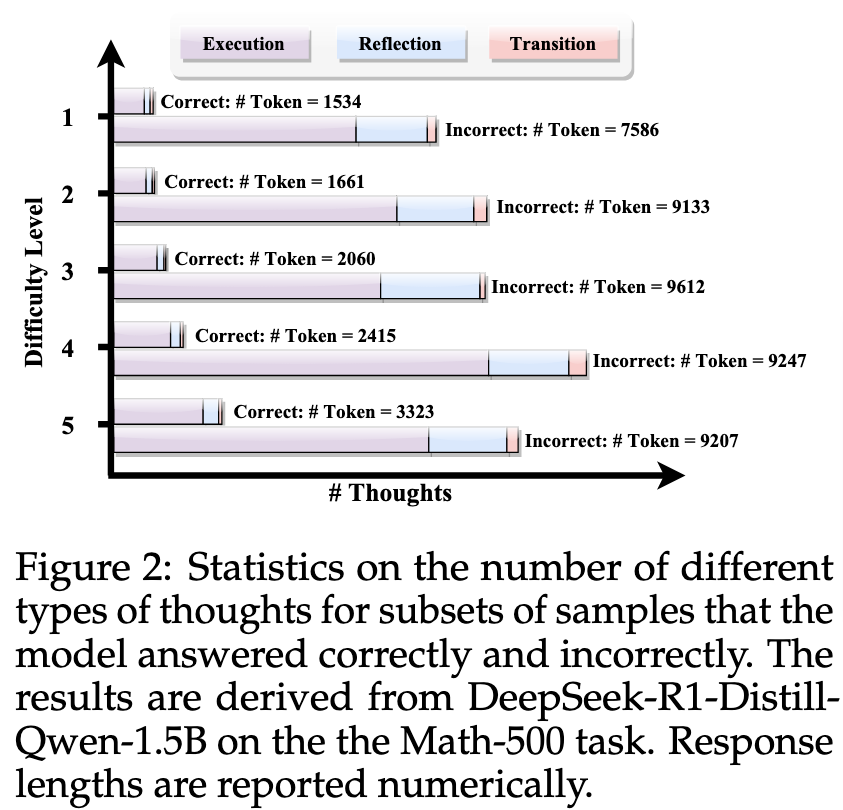 且每种类型的思维在错误案例中均表现出更多的步骤。鉴于正确和错误样本的难度具有可比性,这些结果表明,此类过多的推理步骤在必要推理过程之外引入了显著冗余,并可能对性能产生负面影响。