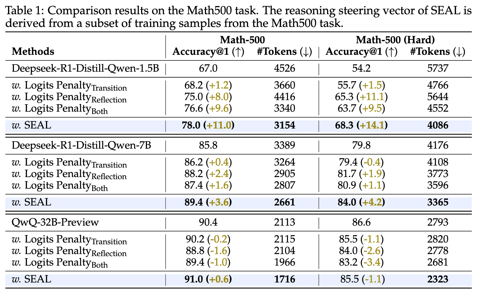 大语言模型(Large Language Models,LLMs),例如 OpenAI 的 o1 系列,已展现出通过扩展的思维链(chain-of-thought,CoT)推理机制处理复杂推理任务的出色能力。然而,最近的研究(Fu 等,2024;Wang 等,2025)揭示了 CoT 推理轨迹中存在显著冗余,这不仅增加了推理延迟,还因将注意力分散至不必要的推理路径而对模型性能产生负面影响。为了解决这个问题,我们研究了 LLMs 内部的推理结构,并将其归类为三种主要思维类型:执行(execution)、反思(reflection)和过渡(transition)思维。此外,我们的分析表明,过多的反思与过渡思维与失败案例高度相关,并且这些思维类别在潜在空间中表现出清晰的分离性。基于这些发现,我们提出了 SEAL(Steerable rEAsoning caLibration),一种无需训练的方法,可无缝校准 CoT 过程,在提高准确性的同时展现出显著的效率提升。SEAL 包括一个离线阶段,用于在潜在空间中提取推理引导向量;随后是在推理过程中通过表示干预利用该引导向量进行即时校准。值得注意的是,该引导向量在多种任务之间表现出强迁移能力。广泛的实验在多个模型(DeepSeekR1-Distill 和 QwQ-32B-Preview)以及多个基准(Math500、GSM8K、LiveCodeBench)上验证了 SEAL 的有效性,准确率最高提升了 11%,同时推理 token 减少了 11.8% 至 50.4%。