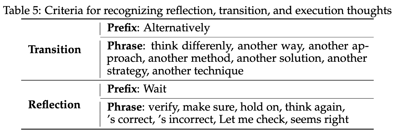 从数据集中抽取出一部分作为验证集,让 Reasoning 模型进行推理,并依据\n\n 切分成多个 thought,使用关键字将 thought 进行归类(‘Alternatively’就归类为过渡)