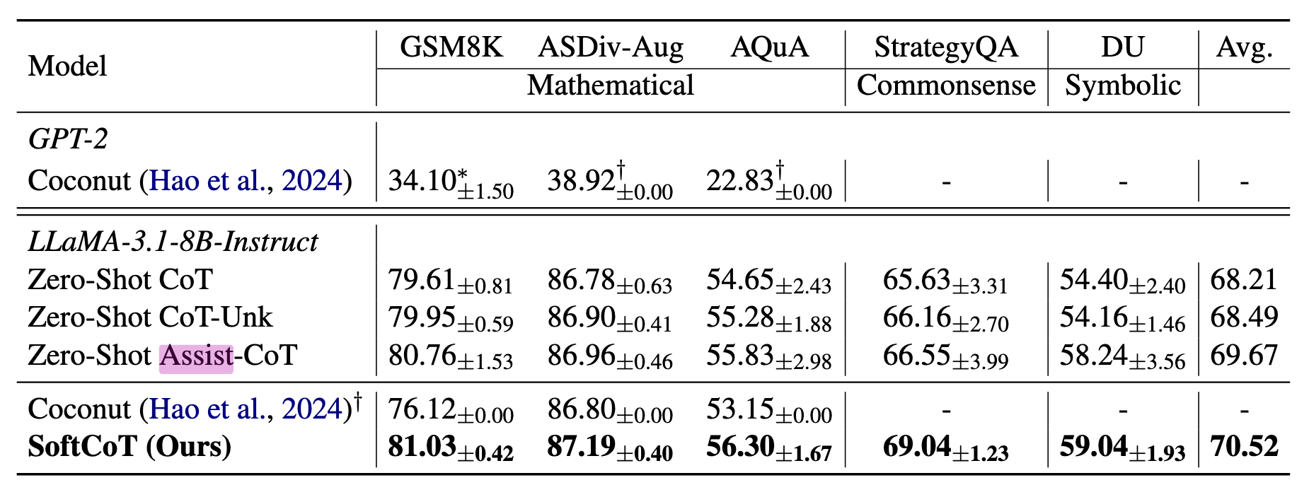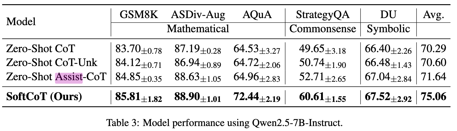 - CCoT 和 Coconut 性能下降,推测可能对于 GPT-2 比较合适但是对于新模型效果不佳(SoftCoT 作者归因为灾难性遗忘)