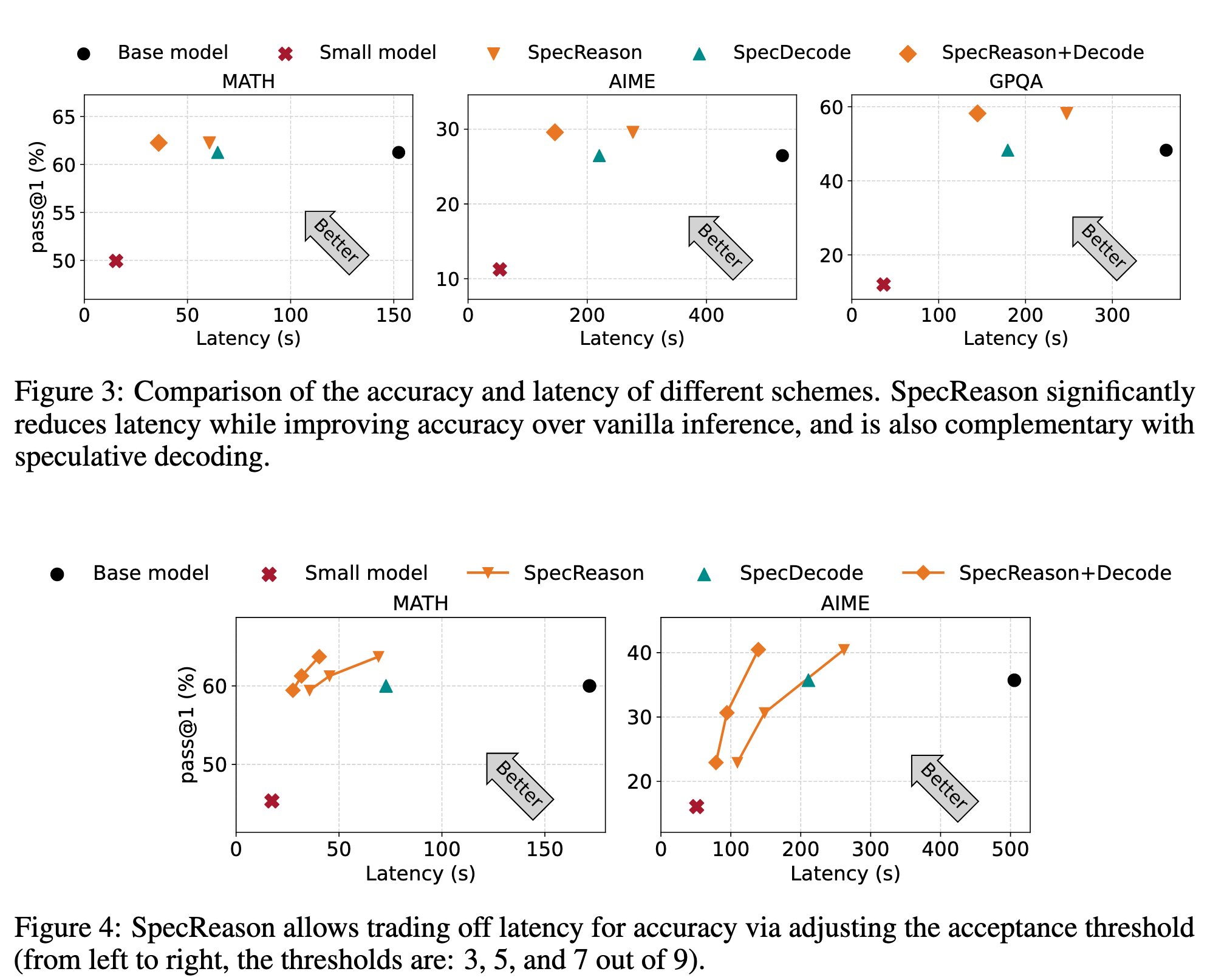 SpecDecode 是投机采样、SpecReason+Decode 是投机采样 + 本文方法,Fig3 中 score 阈值为 7