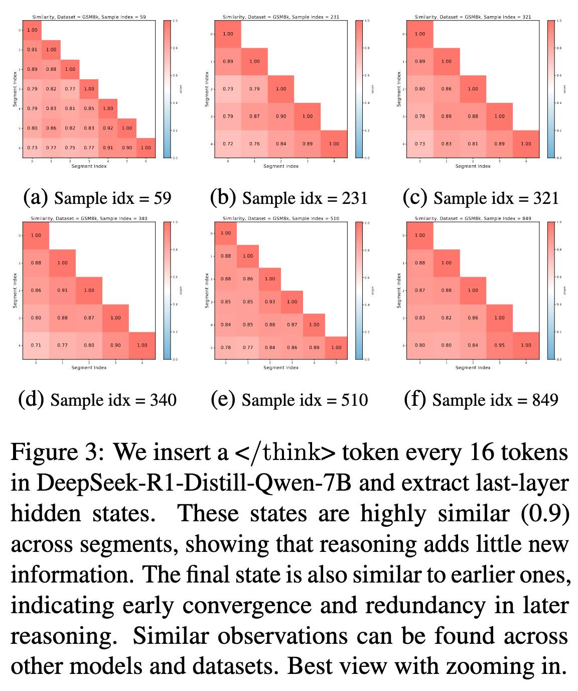 在 DeepSeek-R1-Distill-Qwen-7B 推理中每 16 个 token 的地方插入提前终止思考一次,并提取出的隐藏状态
