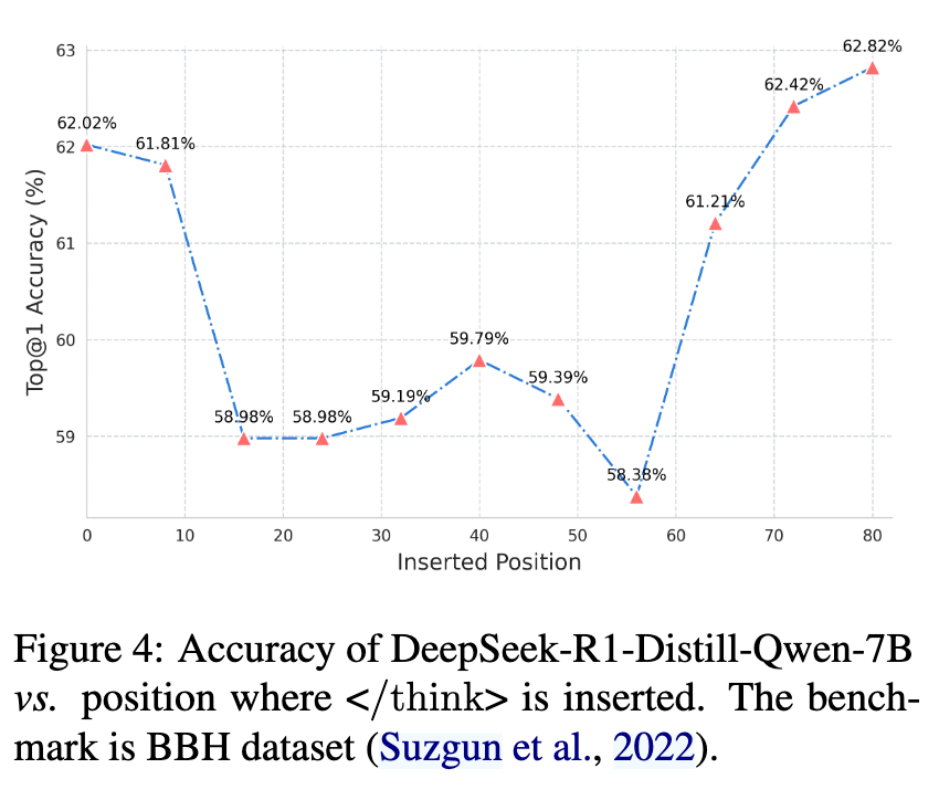基于上述现象,提出假设,在推理过程中,之前,存在一个 token,已经具备了足够的信息,在此 token 以后添加能在有足够的信息后终止思考。