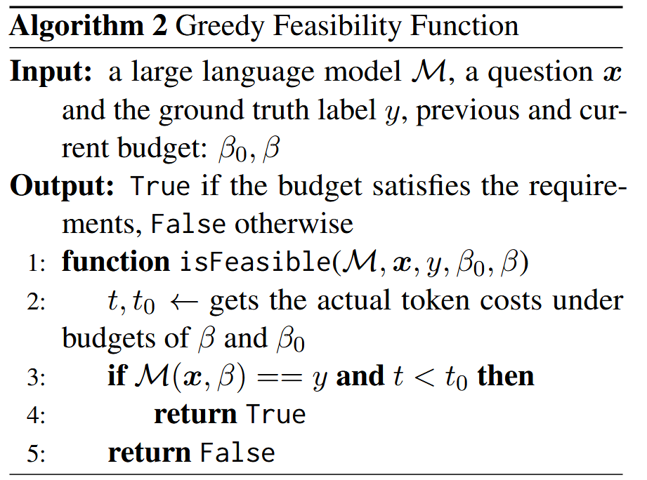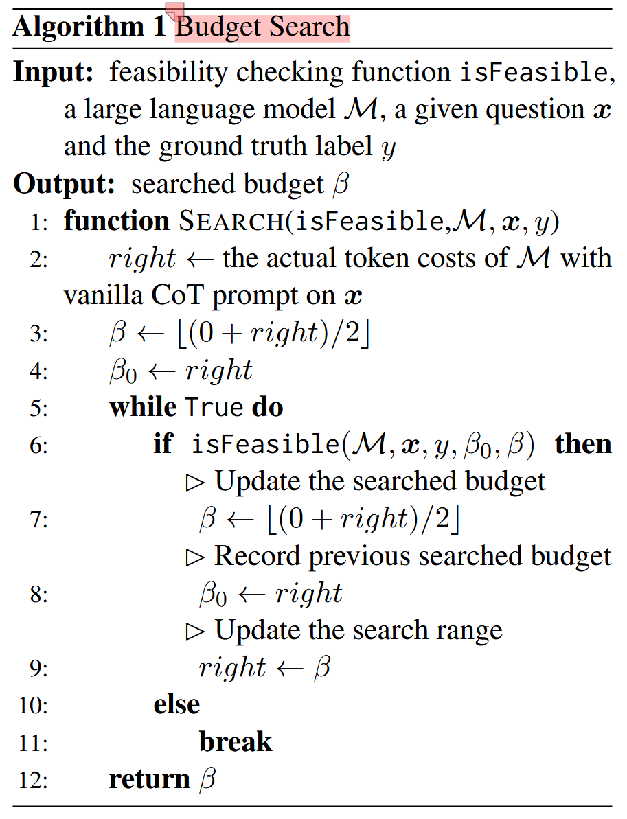 - 二分查找,使用二分查找的方式,找寻解决某个问题的最小 token 预算,isFeasible 实际上是在判断模型输出是否正确以及模型对于预算遵循情况