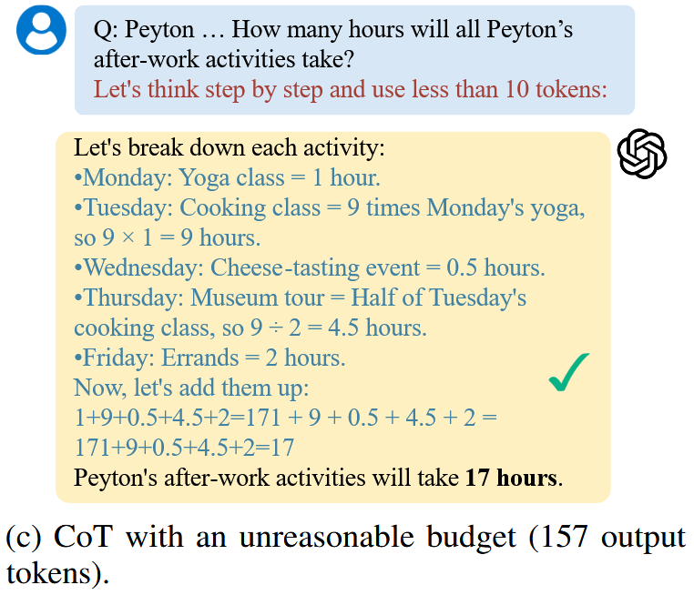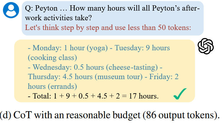 llm 使用推理更容易在各种任务上取得出色表现。但是像 CoT 这种推理方法会导致 token 开销的大幅增加,增加成本。作者发现当 llm 的推理过于冗长的情况下,可以通过在提示中包含合理的 token 预算来压缩(王新昀:更确切的说是减少推理输出),但是 token 预算的大小对于“压缩”效果上起着至关重要的作用。