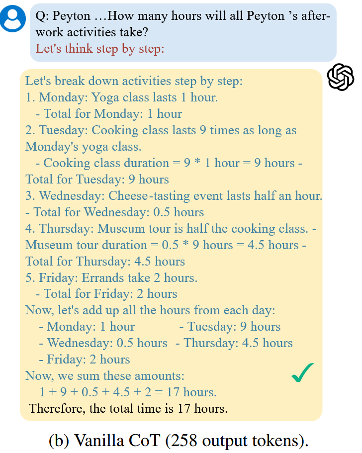 CoT 能显著提升 llm 性能,但是也产生了大量的额外开销,比如 token 数量的增加、延时增加等等,最终导致额外的金钱和能源消耗。