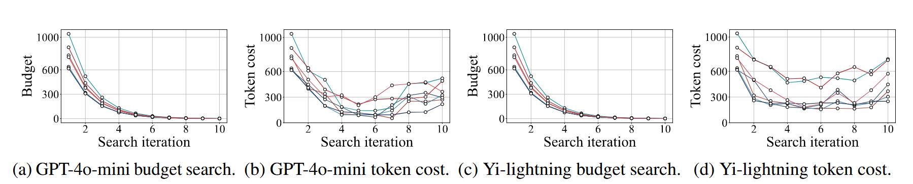 我们发现如果预算降低到某个范围之外,token 成本会增加,这表明进一步减少预算会导致 token 消耗的增加。下图横轴代表搜索轮次,轮次越大,预算越小。不同颜色表示从 MathBench-College(Liu 等人,2024)中随机选取的不同样本。在合理的令牌预算范围内,令牌成本显著较低。当令牌预算小于合理范围时,令牌成本逐渐增加。